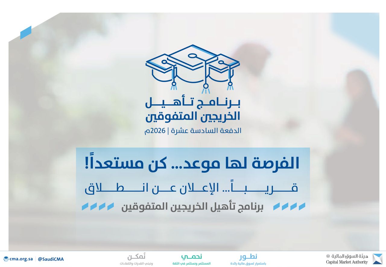 تعلن هيئة السوق المالية عن فتح باب التسجيل للرجال والنساء في برنامج تأهيل الخريجين المتفوقين (الدفعة السادسة عشر)، يهدف البرنامج إلى إتاحة الفرصة للمتدربين لاكتساب الخبرات العملية وصقل مهاراتهم من خلال تنقّلهم بين إدارات الهيئة واطلاعهم وممارستهم للأعمال والأنشطة ذات العلاقة بتخصصاتهم (بعقد تدريب وتأهيل لمدة سنة) لحملة البكالوريوس والماجستير أو الدبلوم العالي في تخصصات (الإدارة، المالية، المحاسبة، القانون، التقنية) التالية: