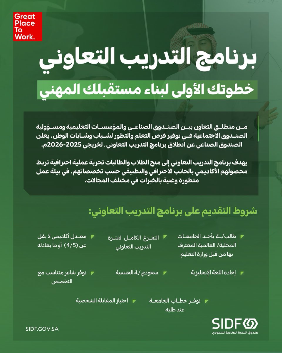 يعلن صندوق التنمية الصناعية السعودي (الصندوق الصناعي) عن فتح باب التقديم في برنامج التدريب التعاوني للرجال والنساء خريجي عام 2025 - 2026م، حملة البكالوريوس والماجستير في جميع التخصصات لتمكين الكفاءات الوطنية الشابة من اكتساب الخبرة العملية في بيئة عمل احترافية تسهم في تطوير المهارات وصقل الخبرات على النحو التالي: